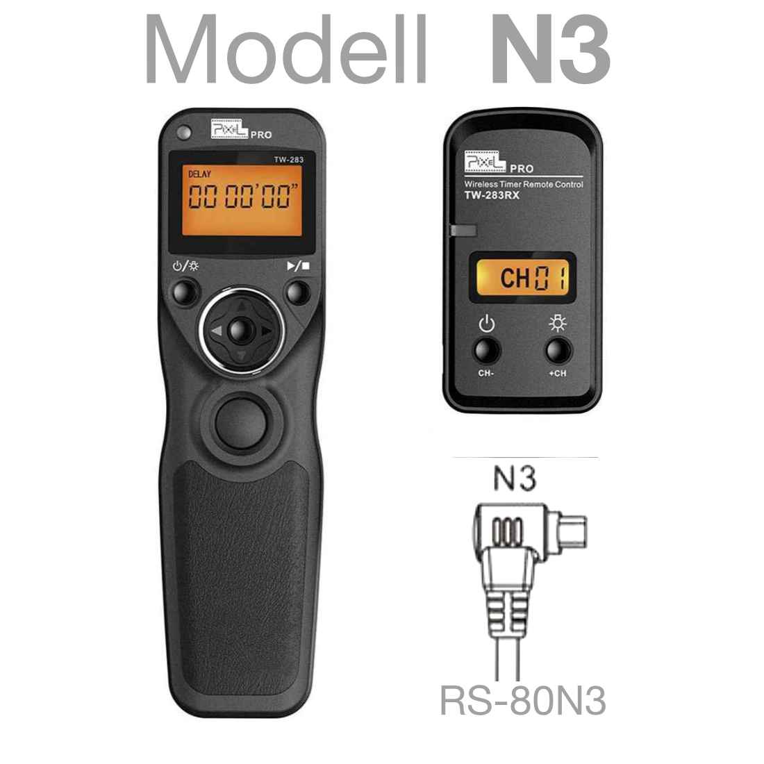 Timer Pixel TW-283 N3. Wireless Auslöser für Canon EOS R8, R7* R6 MK II, R5, EOS R3, EOS M5, M6, EOS 5D IV 5D III 7D II 6D II 1D Serie etc. mit Canon N3 Anschluss. Reichweite bis 100 Meter.