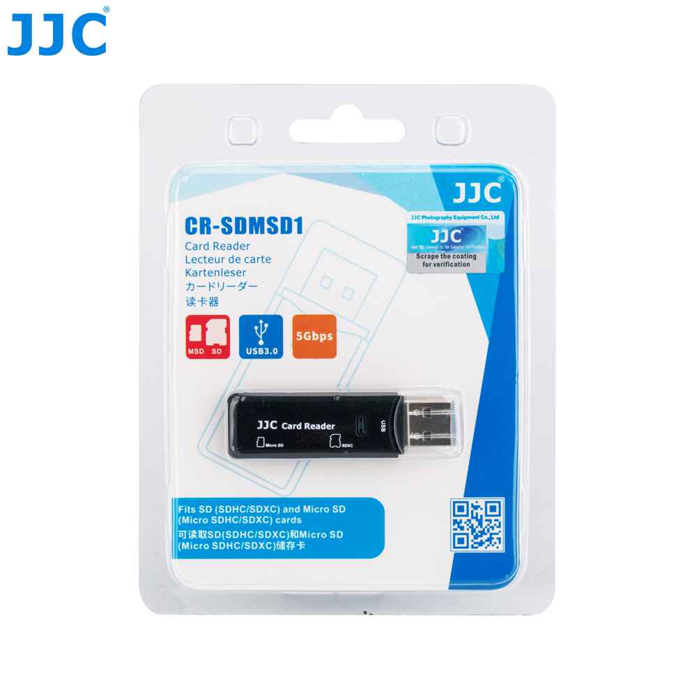 Der JJC CR-SDMSD1 Kartenleser ist klein und schnell, damit kannst man Fotos jederzeit sichern. Der Kartenleser hat 2 Steckplätz je für SD Karten (SDHC/SDXC) oderMicro SD Karten (SDHC/SDXC).