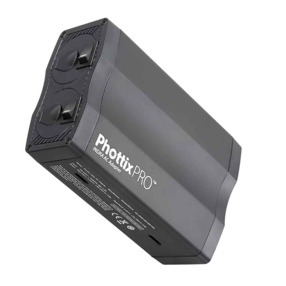 Phottix -AC -Adapter für Indra 500 und Indra 360. Der AC -Adapter kann 2 Indra 500 TTL oder 360 TTL mit Energie versorgen. 110 oder 220 V. SchnellerLadezeiten.
