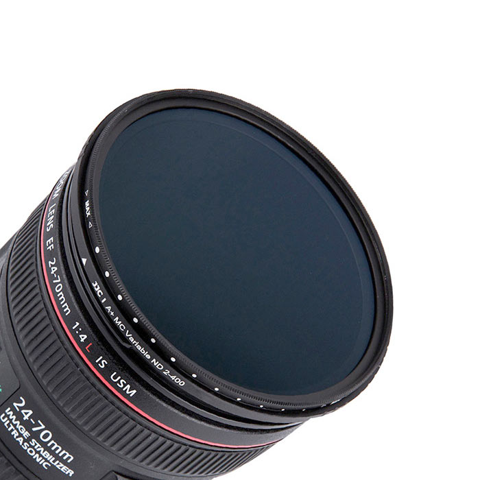 Verstellbarer Graufilter ND2-ND400 - hochwertiger, mehrfach vergüteter Glasfilter mit grösserer Frontlinse zur Vermeidung von Schatten bei Weitwinkeln.